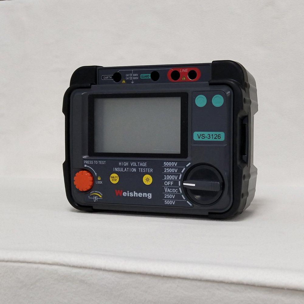 VS-3126Analog isoleringstestaredrivs av åtta 1,5 V IEC LR6 (AA) celler. Designsäkerhetsfunktioner inkluderar högspänningsvarningsindikator, extern spänningsdisplay efter IR-test, automatisk urladdning av reaktiva belastningar och testledningar